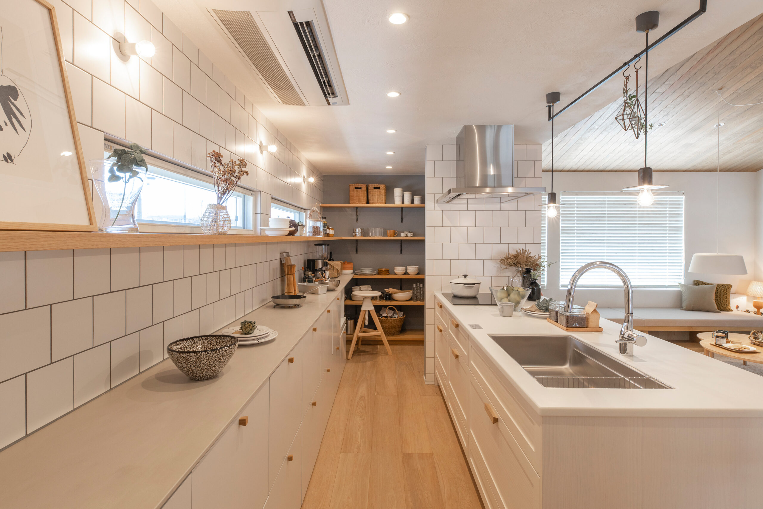 キッチン奥のウォークインパントリーは、たくさん買い物をしても困らない収納力で生活を支えます。主張しすぎない大判のホワイトタイルがシンプルオシャレなナチュラルテイストのキッチンです。