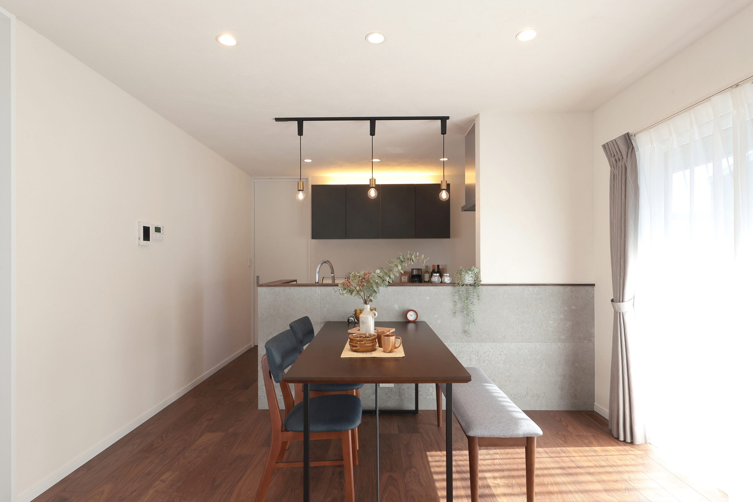 - セメント調のパネルと木の組み合わせで、シックな雰囲気を演出した空間