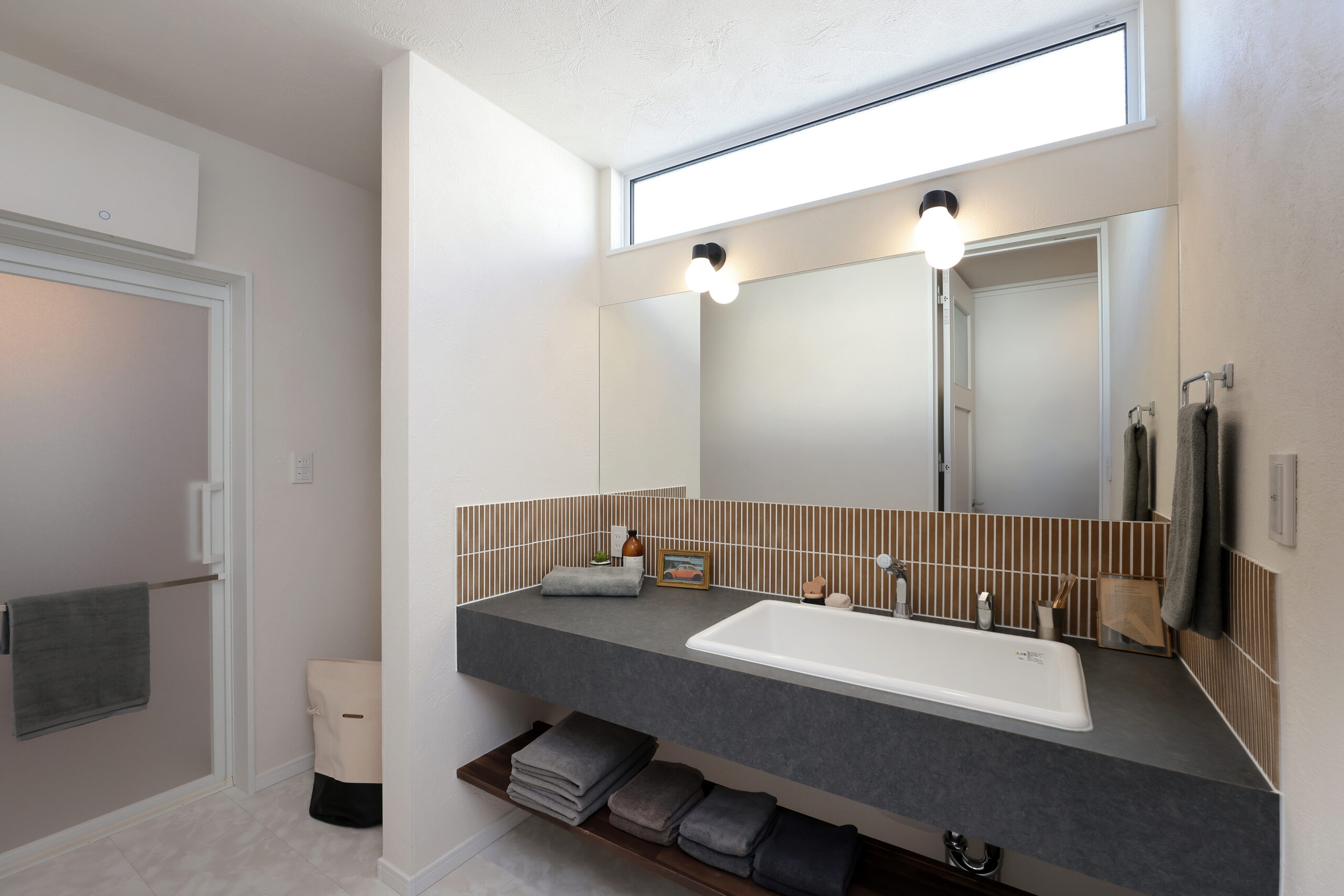 下部の棚は、タオルなどを収納できる